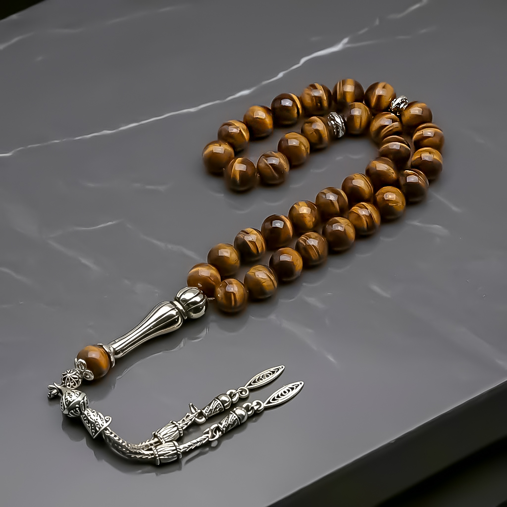 Tiger’s Eye, altın sarısı ile kahverengi tonları arasında değişen ve ışığa göre ipeksi yansımalar gösteren doğal bir taştır. Güç, cesaret ve kararlılık taşı olarak bilinir. Parlak ve dayanıklı yapısı sayesinde tesbih yapımında sıkça tercih edilir.