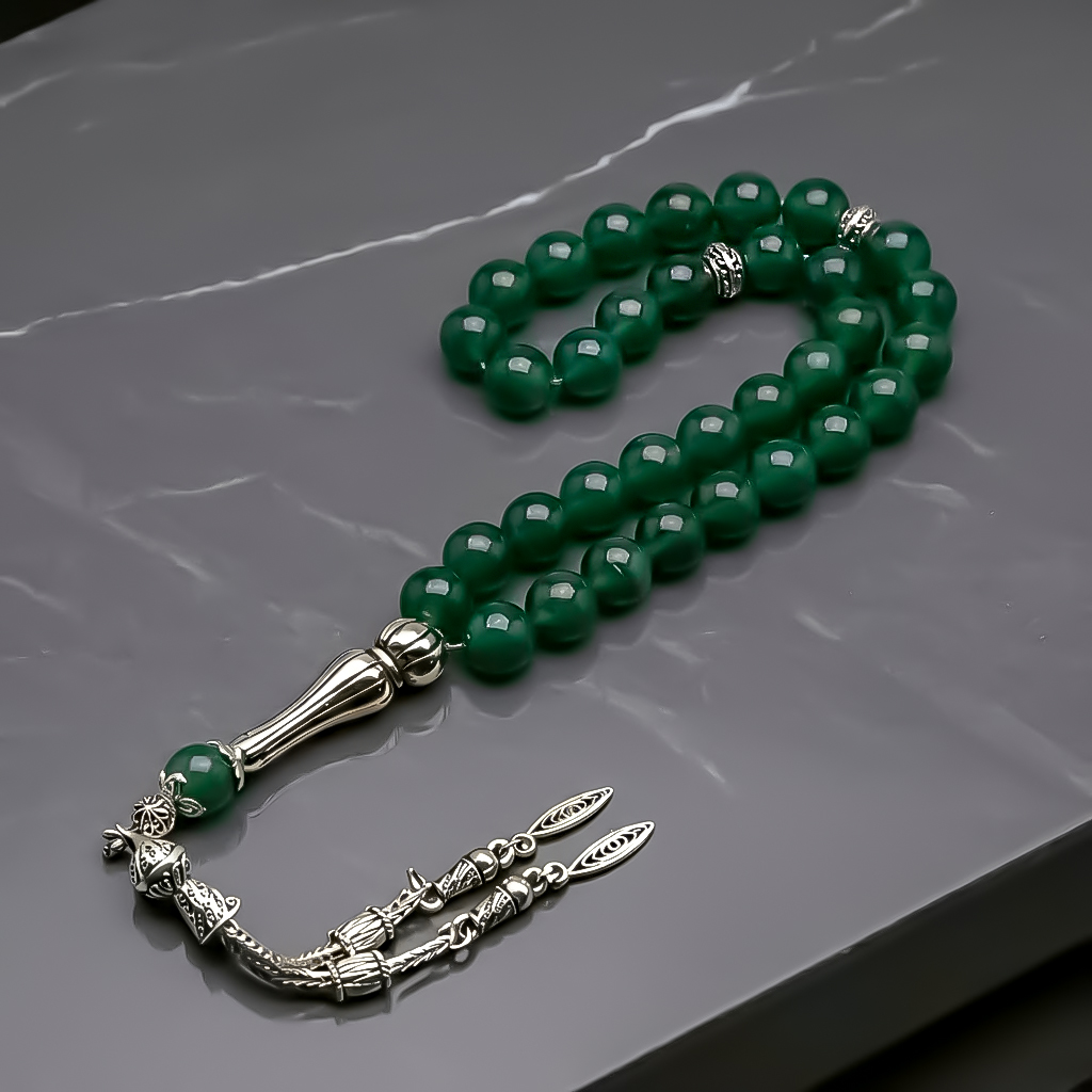 Agate’in yeşil tonlara sahip özel bir çeşididir. Doğanın enerjisini temsil eden rengiyle huzur ve denge taşı olarak bilinir. Dayanıklı yapısı ve parlak görünümü sayesinde tesbih yapımında sıklıkla tercih edilir.
